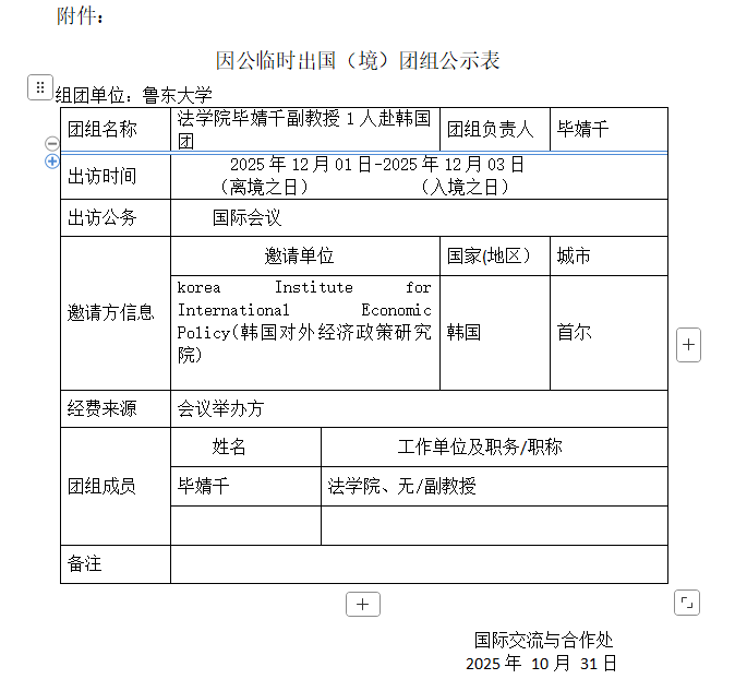 根据因公出国管理工作的实施意见有关规定, 现将法学院毕婧千副教授1人赴韩国执行国际会议任务团组信息予以公示。公示时间为2025年10月31日至2025年11月6日(5个工作日)。如有不同意见,请在公示期内,向国际交流与合作处(电话:0535-6616692)反映。