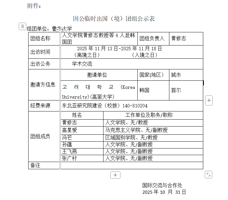 根据因公出国管理工作的实施意见有关规定, 现将人文学院黄修志教授等6人赴韩国执行学术交流任务团组信息予以公示。公示时间为2025年10月31日至2025年11月06日(5个工作日)。如有不同意见,请在公示期内,向国际交流与合作处(电话:0535-6616692)反映。