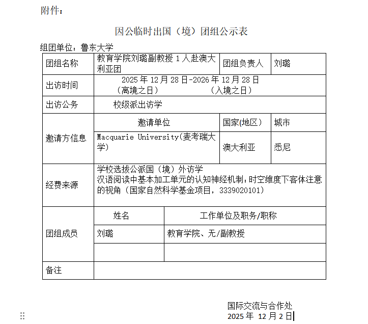 根据因公出国管理工作的实施意见有关规定, 现将教育学院刘璐副教授1人赴澳大利亚执行校级派出访学任务团组信息予以公示。公示时间为2025年12月2日至2025年12月8日(5个工作日)。如有不同意见,请在公示期内,向国际交流与合作处(电话:0535-6616692)反映。