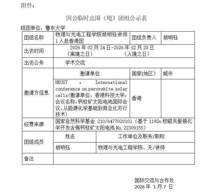 根据因公出国管理工作的实施意见有关规定, 现将物理与光电工程学院胡明钰讲师1人赴香港执行学术交流任务团组信息予以公示。公示时间为2026年1月7日至2026年1月13日(5个工作日)。如有不同意见,请在公示期内,向国际交流与合作处(电话:0535-6616692)反映。