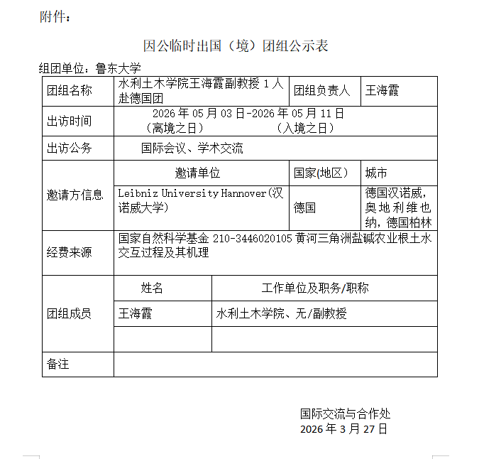 根据因公出国管理工作的实施意见有关规定, 现将水利土木学院王海霞副教授1人赴德国执行国际会议、学术交流任务团组信息予以公示。公示时间为2026年3月27日至2026年4月2日(5个工作日)。如有不同意见,请在公示期内,向国际交流与合作处(电话:0535-6616692)反映。