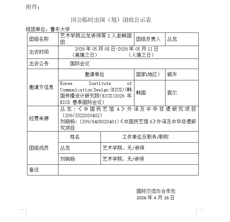 根据因公出国管理工作的实施意见有关规定, 现将艺术学院丛龙讲师等2人赴韩国执行国际会议任务团组信息予以公示。公示时间为2026年4月16日至2026年4月22日(5个工作日)。如有不同意见,请在公示期内,向国际交流与合作处(电话:0535-6616692)反映。